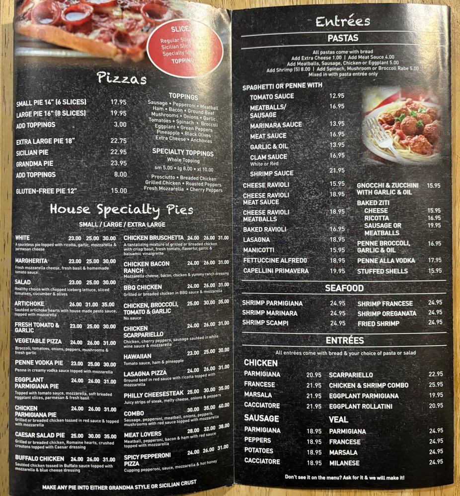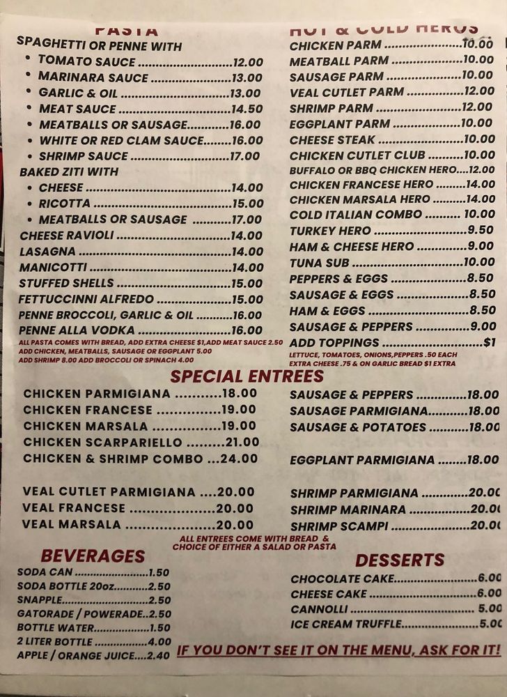 Start with comforting soups like the hearty Minestrone or Pasta e Fagoli, each priced at just $7.95. The appetizing Antipasto Salad, featuring a medley of salami, ham, and provolone cheese, is a perfect way to kick off your meal for $14.95.